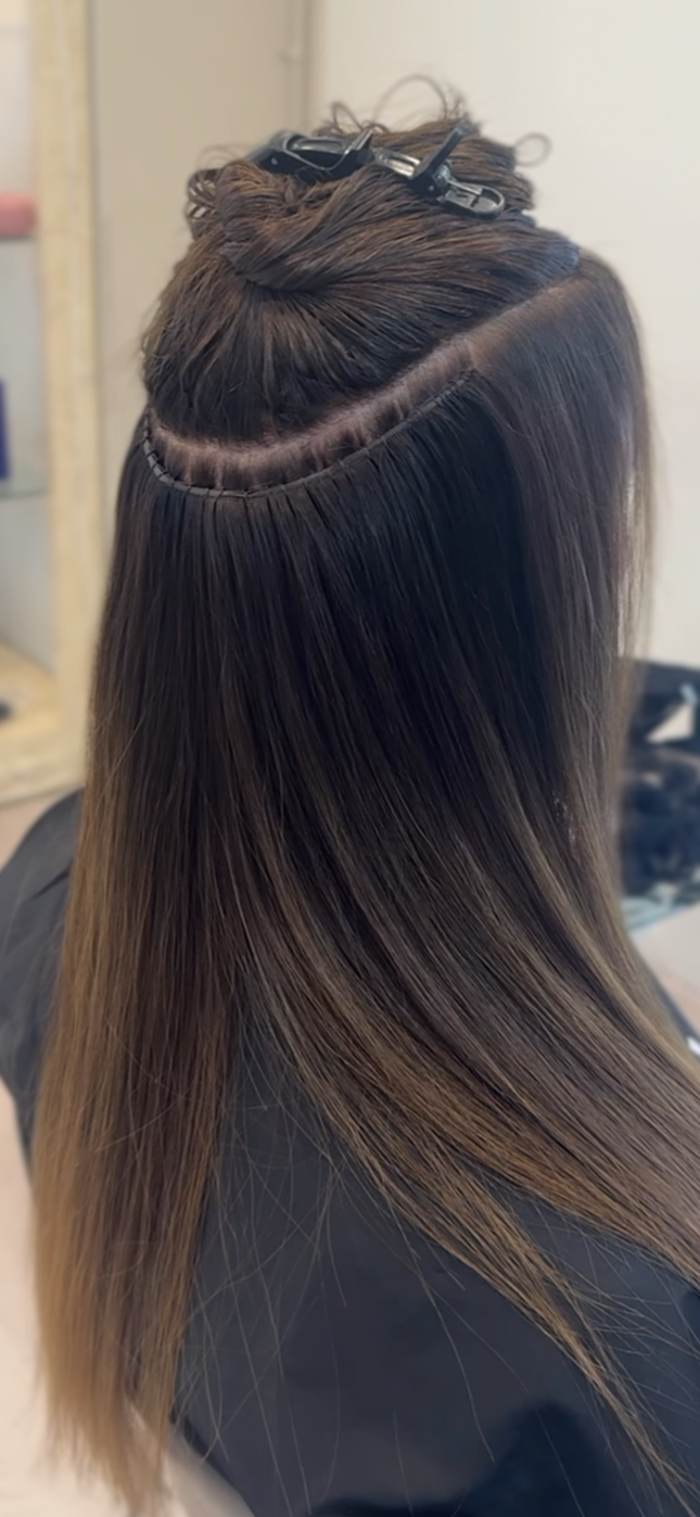 They work by attaching small, discreet beads to your natural hair, then securing the weft along those anchor points. Because the weight is distributed evenly, weft hair is gentle and damage-free when applied by a trained specialist. The finish is smooth, seamless, and incredibly natural.